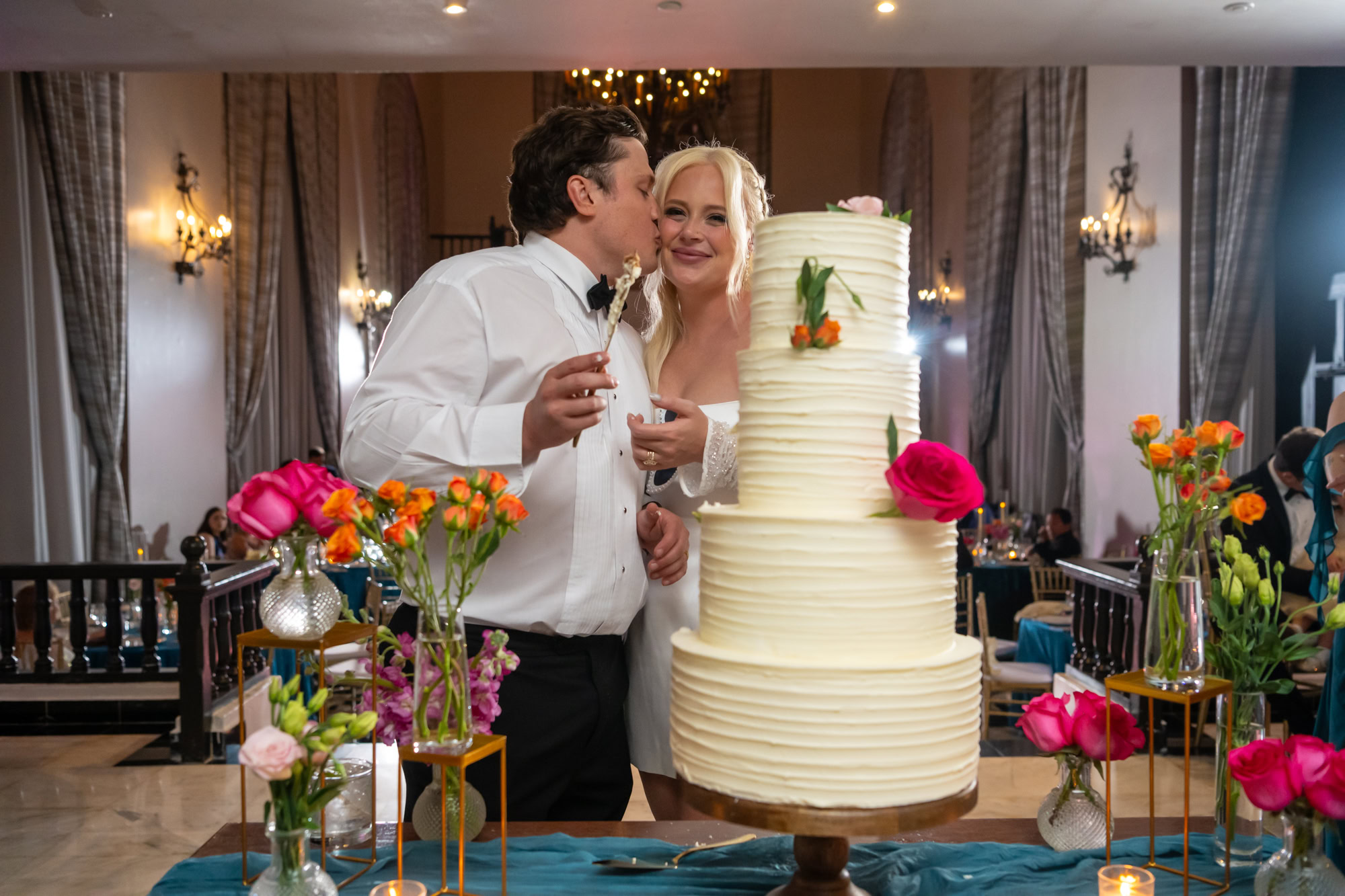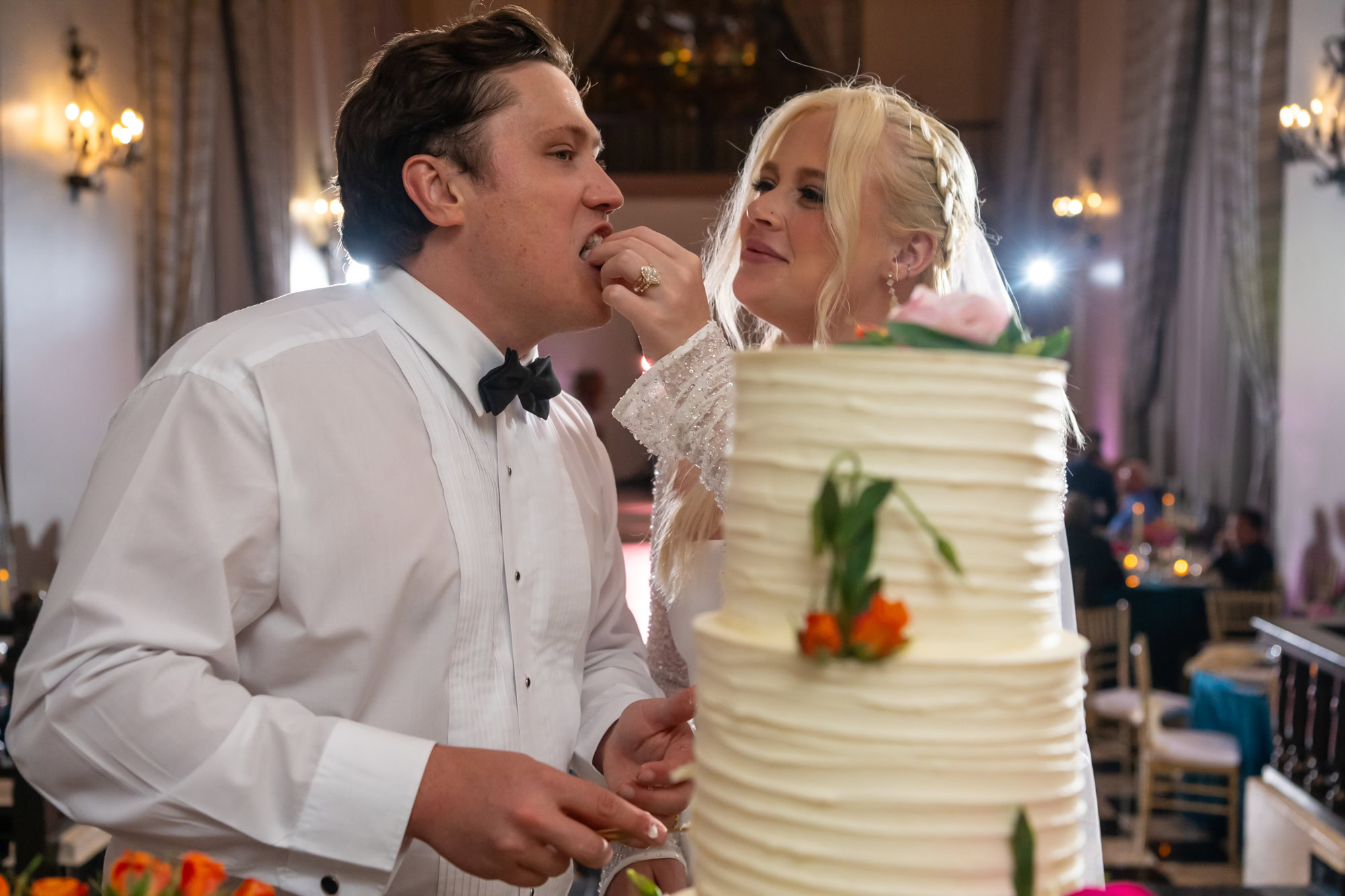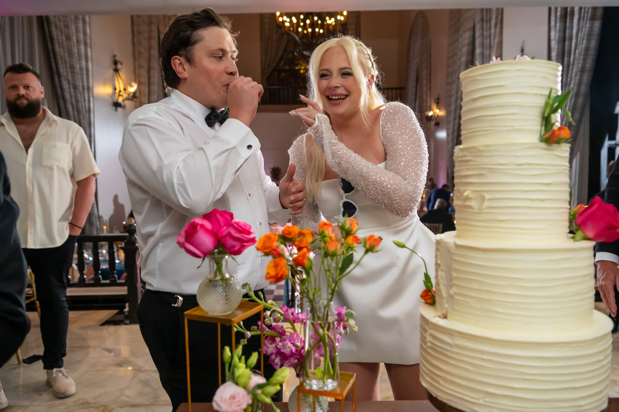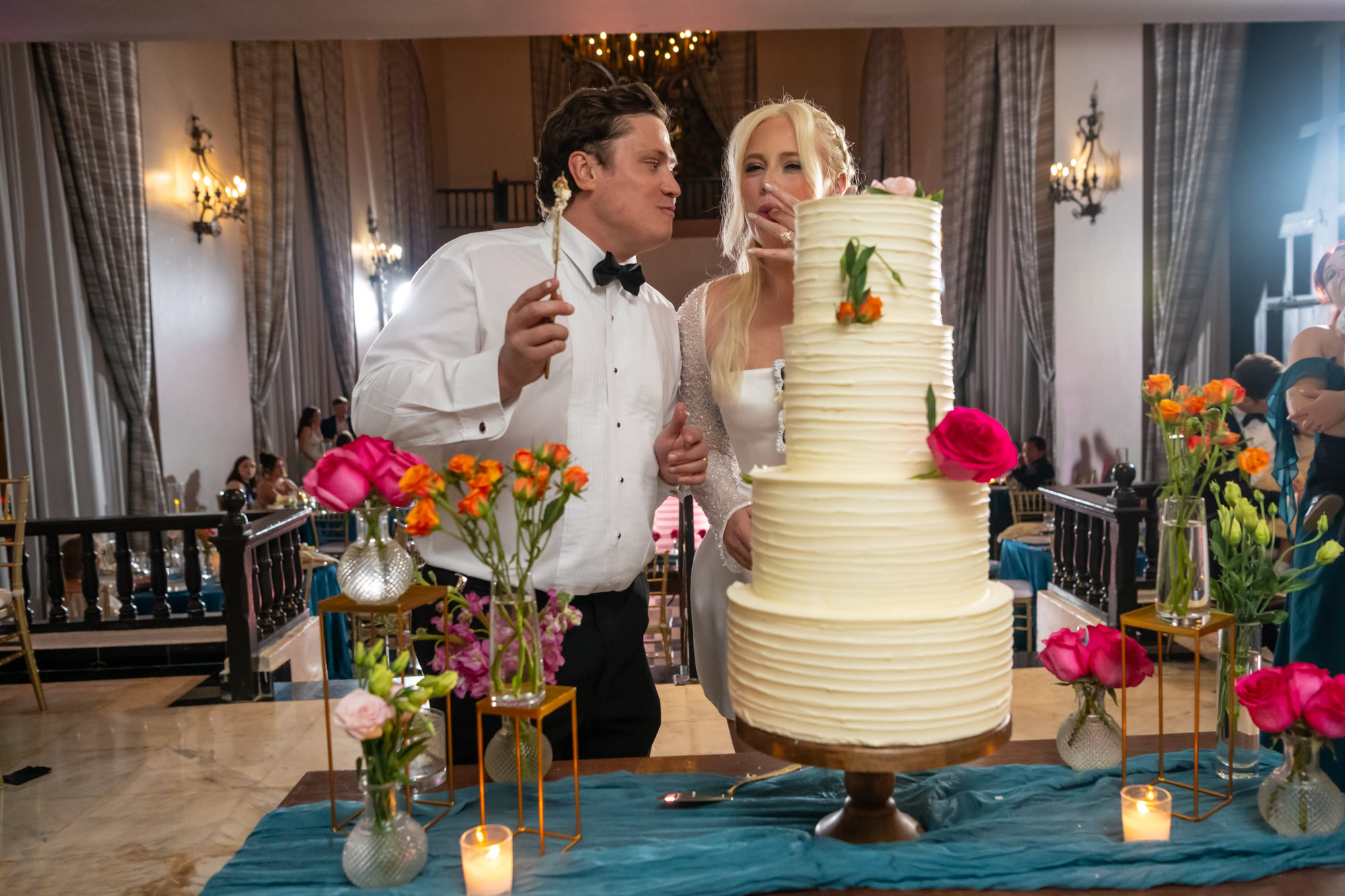 Every wedding has a story—and for this one, it was the cake. As the couple began to slice their wedding cake, it tilted dramatically. While guests gasped, the couple laughed, caught it mid-fall, and shared a spontaneous moment of joy that became one of the most beloved photos of the day.